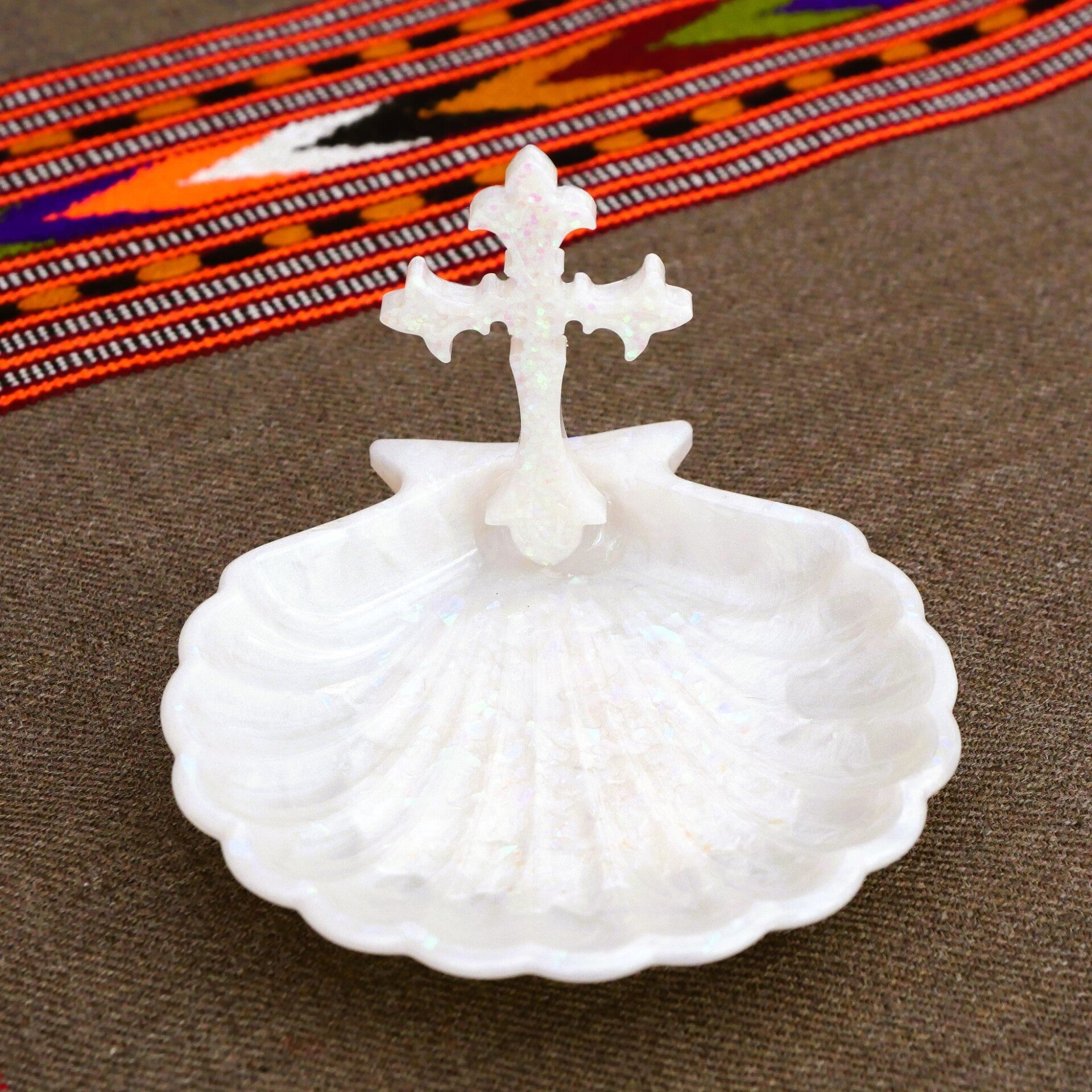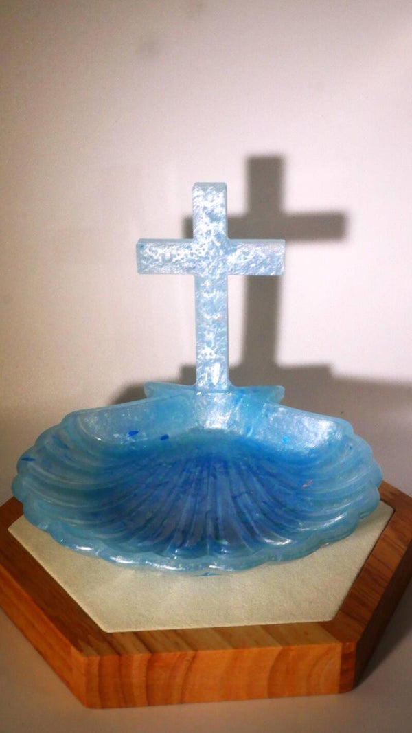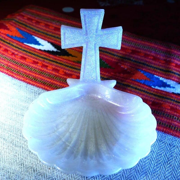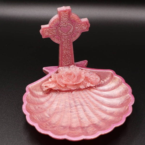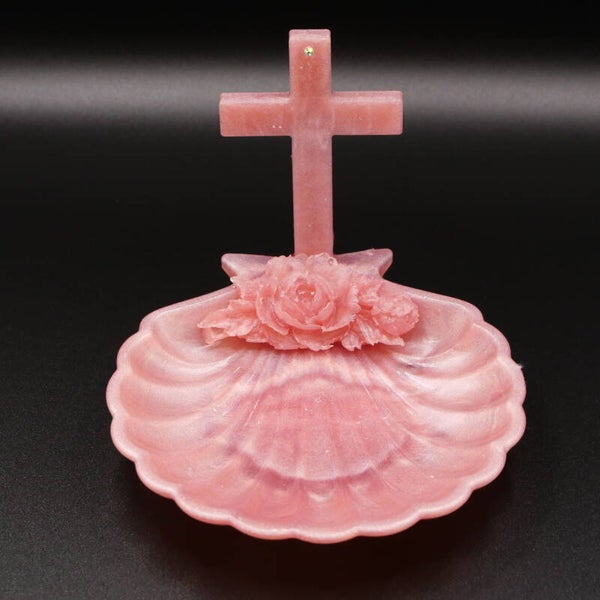 Délicat repose chapelet Chrétien en forme de coquille st jacques de compostelle. Proposé en différentes couleurs teintés dans la masse. Petit et élégant pour poser son chapelet entre deux rosaires.