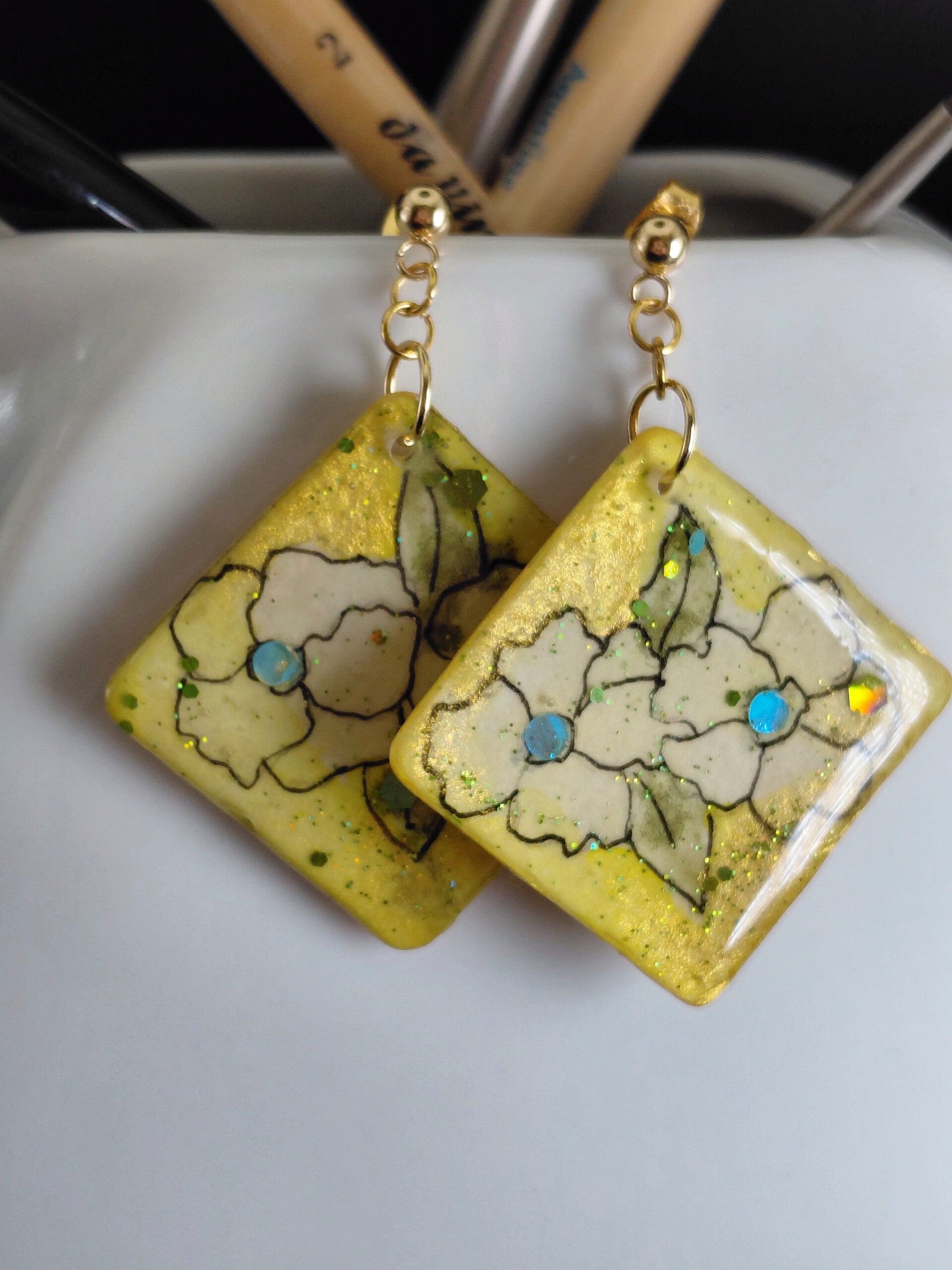 Précieuses boucles d'Oreilles en Aquarelle et dessins Vintage, résinées avec amour.