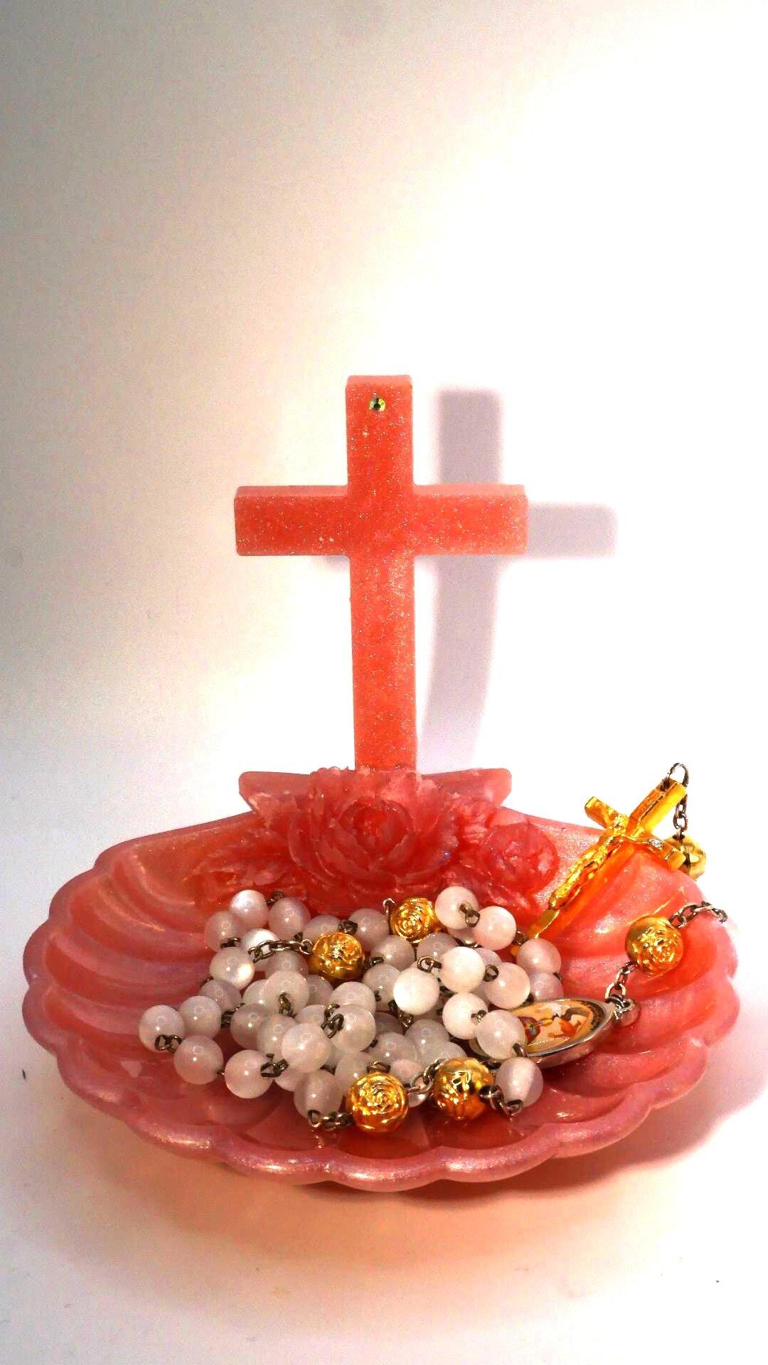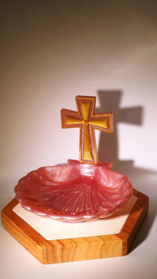 Délicat repose chapelet Chrétien en forme de coquille st jacques de compostelle. Proposé en différentes couleurs teintés dans la masse. Petit et élégant pour poser son chapelet entre deux rosaires.