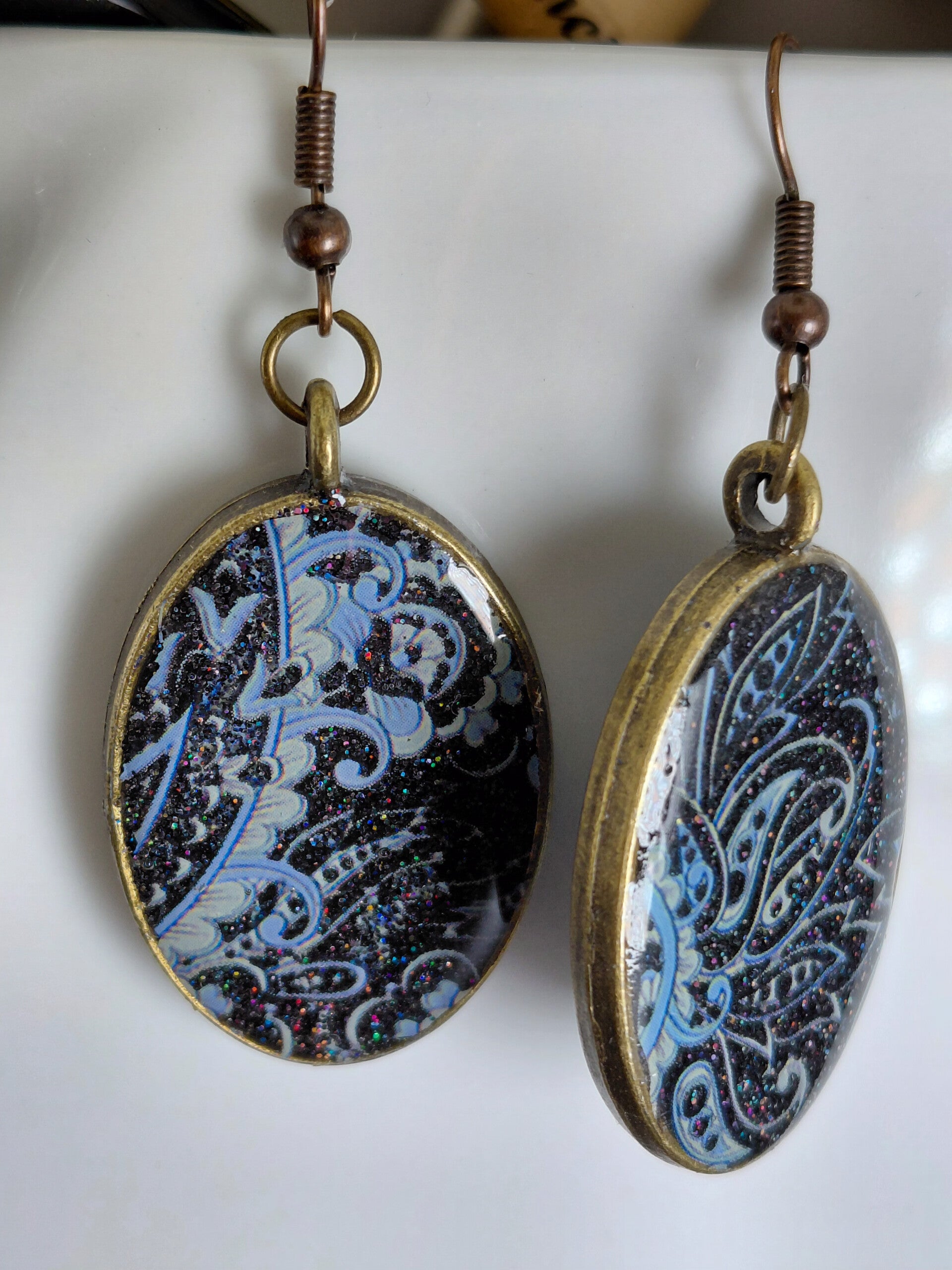 Précieuses boucles d'Oreilles en paillettes holographiques noirs, résinées avec amour.