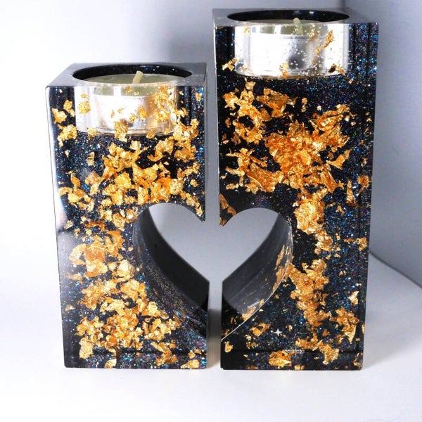 2 bougeoirs fond holographique bleu nuit et feuilles d'or, en résine