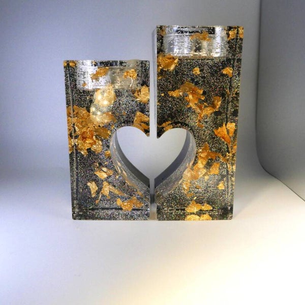 2 bougeoirs fond holographique argent et feuilles d'or, en résine